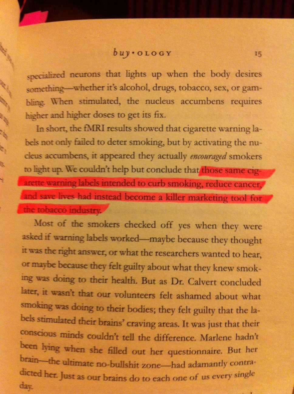 Şimdi başka bir araştırmaya geçelim. Neuromarketing araştırmasına[2].  Bu araştırma, katılımcılara anket doldurtup, daha sonra bu ankete verdikleri cevapları gösterilen görüntülere baktıklarında beyinlerinin ısınan bölgesi ile kıyaslayan bir deli araştırma. Katılımcılara şu soru soruluyor: “Sigara paketlerinin üzerindeki resimler sigara içme isteğinizi azaltıyor mu?” katılımcılar bu soruya evet diye cevap veriyorlar. Rasyonel beyin devrede, bu sorunun cevabı evet olmalı. Daha sonra aynı katılımcılara kafalarına beyinlerinin hangi bölgesinin ısındığını ölçecek cihazlar takılıyken bu resimleri gösteriyorlar. Bulgular inanılmaz: Isınan bölge kişilerin sigara istediği zaman ısınan  alanla aynı. Yani rasyonel aklınız ankette size sigara içmemi baskılıyor dedirtirken aslında bu resimler sizde tam ters etki yaratıyor, ve sigara içmek istemenize yol açıyor.
