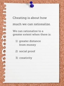 Sosyal onay: başka birinin hile yaptığını gördüğümüzde sahtekarlığı normalleştiriyoruz. Hile yapıp daha çok para alan birini gören denekler ortalaması 4, hileli ortalaması 6 olan görev deneyinde ortalama 8 çıkarıyorlar 🙂