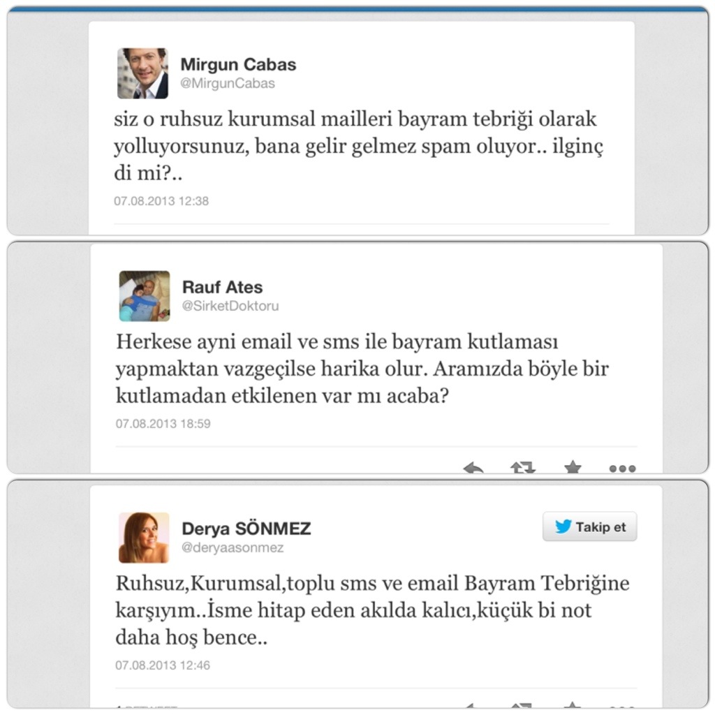 1. Beni düşündüren bir nokta var, samimiyeti öldüren acaba kurumsallık mı, yoksa teknoloji mi? Teknolojinin gelişmesiyle tebrik gönderebileceğimiz insan sayısı 100’lere ulaştıkça, samimiyetsiz maillerden başka uygulanabilir bir yöntem var mı? Hiç tebrik atmamaktansa en azından samimiyetsiz de olsa tebrik atmak hatırladığımızı gösterir diye düşünüyorum. Bunun yanında özel gördüğümüz insanlara da ayrıca telefon etmek en güzeli bence. Benim naçizane tecrübem, isme atılan mailler de kurumsal samimiyetsiz maillerden çok farklı etki yaratmıyor. Telefon ise çok farklı, sesi duymak samimiyet duygusunu çok iyi hissettiriyor.