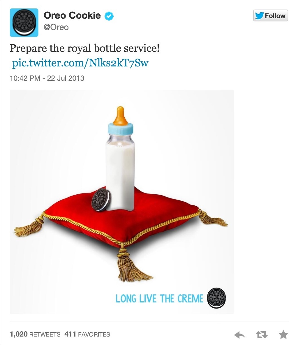 Oreo benzer bir stratejiyi sosyal medyada gündem ile ilgili hızlı ürettiği paylaşımlarla da takip ediyor. Aşağıdaki iki paylaşımı pek çok internet sitesinde konuyla ilgili en başarılı sosyal medya paylaşımı olarak alıntılandı. Birinci alıntı Huffington Post’dan, Amerikan Super Bowl karşılaşmasında elektrik kesilince attıkları tweet – ‘Elektrik kesildi ama sorun yok. Karanlıkta da içeceğinize banabilirsiniz’:
