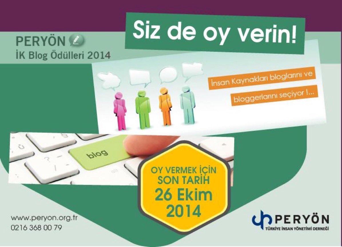 PERYÖN kongresine günler kala, insan kaynakları konusunda bloglarında içerik ve fikir üretenleri ödüllendiren PERYÖN İK Blog Yarışması da başladı. Bloğum da adaylar arasında. Sizlerle paylaştığım içeriği beğeniyor, insan kaynakları alanında fikir ürettiğimi düşünüyorsanız beni destekleyebilirsiniz. Oy vermek isterseniz aşağıdaki linkten ulaşabilirsiniz: