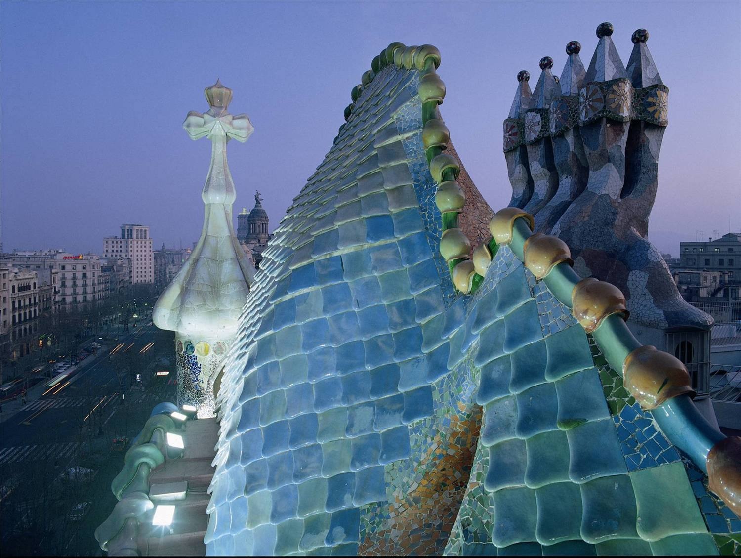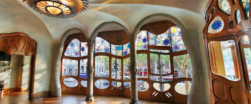 Gaudi ‘ışığı bir mimari öğe’ olarak kullanmış, doğadan ilham almış, renkleri en canlı halleriyle kullanmaktan çekinmemiş ve sıradan/standart ‘düz duvar’ları reddetmiş. Aşağıda gördüğünüz fotoğraflar benim favorim olan ev Casa Battlo‘dan. Duvarları kıvrımlı, camları güneşin ışık oyunlarını zenginleştirmek için renkli. Çatısı ejderhanın sırtı ve ona saplanmış kılıcın sapından esinlenerek yapılmış.