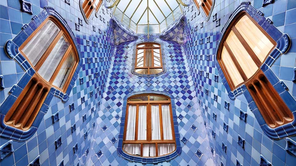 Bu fotoğraf ise evin içi. Gaudi yukarıdan aşağıya ışığın azalarak inişini dengelemek için seramikleri giderek açılan tonlarda kullanmış, pencereleri de büyütmüş.